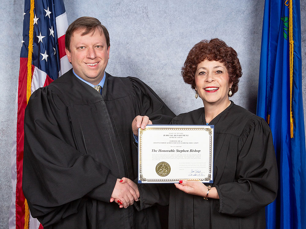 జస్టిస్ ఆఫ్ పీస్ స్టీఫెన్ బిషప్ నెవాడా సుప్రీంకోర్టు ప్రధాన న్యాయమూర్తి ఎలిస్సా కాడిష్ నుండి విద్యా అవార్డును అందుకున్నారు. ఈ అవార్డు న్యాయ విద్యలో న్యాయమూర్తి బిషప్ సాధించిన విజయాలను మరియు నెవాడాలో న్యాయ నాణ్యతను మెరుగుపరచడంలో అతని వ్యక్తిగత కృషిని గుర్తిస్తుంది. . (ఫోటో అందించబడింది)
