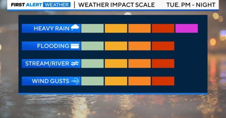 WJZ ఫస్ట్ అలర్ట్ వెదర్ టీమ్ భారీ వర్షం కోసం ‘వాచ్ డే’ని జారీ చేసింది, ఇది గాలులతో కూడిన కురుస్తున్న వర్షాలు, వరదలు, నది మరియు ప్రవాహాల వరదలు, తీరప్రాంత వరదలు మరియు బలమైన గాలుల నుండి నష్టాన్ని కలిగించవచ్చు. భారీ వర్షం మంగళవారం అర్థరాత్రి ముగుస్తుంది, అయితే బలమైన గాలులు బుధవారం వరకు కొనసాగుతాయి.