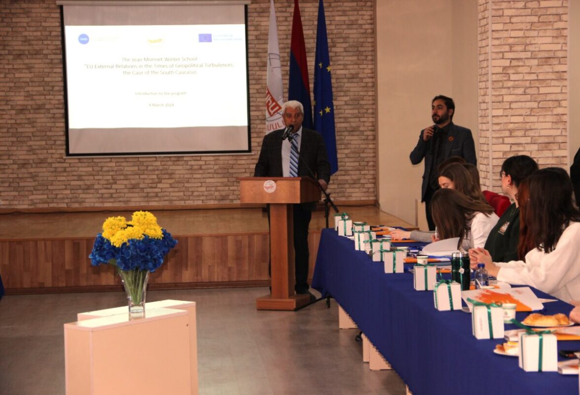 జీన్ మొన్నెట్ వింటర్ స్కూల్ “భౌగోళిక రాజకీయ తిరుగుబాటు సమయంలో EU బాహ్య సంబంధాలు: దక్షిణ కాకసస్ కేసు” ఈరోజు యురేషియన్ ఇంటర్నేషనల్ యూనివర్శిటీలో ప్రారంభించబడింది. ఆక్స్ఫర్డ్, లీప్జిగ్, బెర్లిన్-హంబోల్ట్, డ్రెస్డెన్ మరియు ఇతర ప్రధాన యూరోపియన్ విశ్వవిద్యాలయాల నుండి 30 కంటే ఎక్కువ మంది విద్యార్థులు రెండు వారాల విద్యా కార్యక్రమం యొక్క చట్రంలో ఆర్మేనియాకు చేరుకున్నారు. ఈ కార్యక్రమంలో ప్రముఖ విద్యావేత్తలు మరియు అభ్యాసకులు బోధించే ఇంటరాక్టివ్ తరగతులు, మానవతా మరియు అభివృద్ధి ప్రాజెక్టుల రూపకల్పన మరియు అమలు మూల్యాంకనంపై శిక్షణా సెషన్లు, రిపబ్లిక్ ఆఫ్ ఆర్మేనియా యొక్క నేషనల్ అసెంబ్లీ సందర్శనలు, రిపబ్లిక్ ఆఫ్ ఆర్మేనియా యొక్క రాజ్యాంగ న్యాయస్థానం మరియు ప్రతినిధులతో సమావేశాలు ఉన్నాయి. రిపబ్లిక్ ఆఫ్ ఆర్మేనియా. ఇది చేర్చబడింది. EU యొక్క ప్రతినిధి బృందం నుండి అర్మేనియాకు మరియు అంతర్జాతీయ న్యాయ వ్యవహారాలకు ప్రభుత్వ ప్రతినిధి బృందం నుండి నిపుణులతో చర్చలు, EU-నిధుల ప్రాజెక్టులు మరియు గొప్ప సాంస్కృతిక కార్యక్రమం.