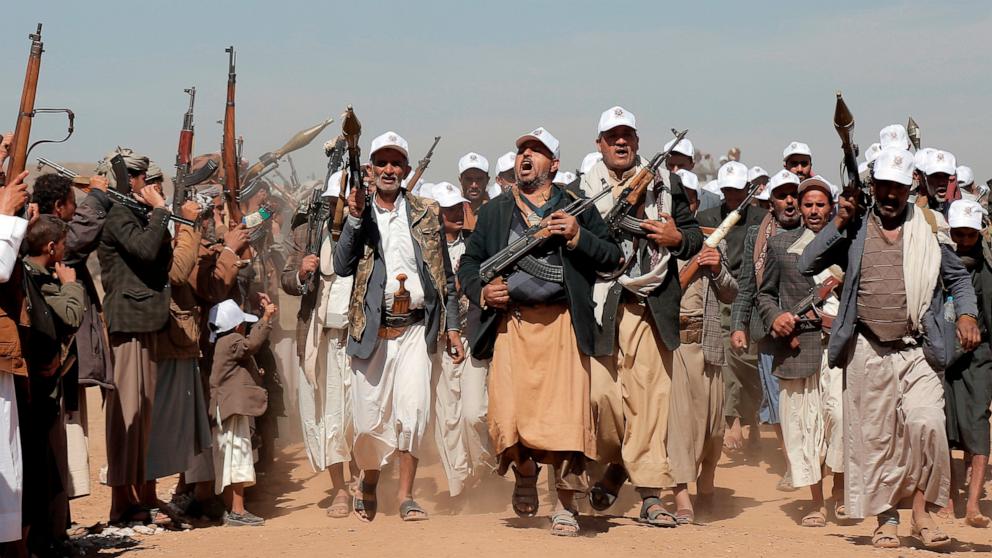 జనవరి 22, 2024న గాజా స్ట్రిప్‌లోని పాలస్తీనియన్లకు మద్దతుగా మరియు యెమెన్‌పై US దాడికి వ్యతిరేకంగా జరిగిన ర్యాలీలో హౌతీ యోధులు సనా శివార్లలో కవాతు చేశారు. AP