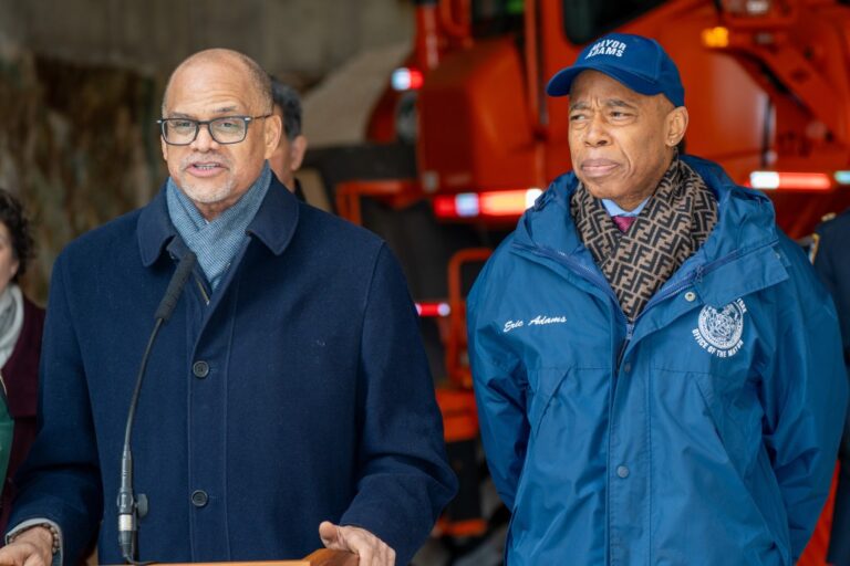ప్రెసిడెంట్ డేవిడ్ బ్యాంక్స్ (ఎడమ) మరియు మేయర్ ఎరిక్ ఆడమ్స్ ఫిబ్రవరి 12, 2024న మాన్‌హాటన్‌లో మాట్లాడుతున్నారు (న్యూయార్క్ డైలీ న్యూస్ యొక్క థియోడర్ పారిసియెన్)