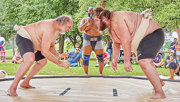 అమెరికన్ ఫ్రైట్ సమీపంలోని మాల్ యొక్క ప్రధాన ద్వారం గుండా ప్రవేశించినప్పుడు, పోషకులు ఒటాకు ఫుడ్ ఫెస్టివల్లో భాగంగా ఒక వైపు సుమో కుస్తీని చూస్తారు. (ఫోటో అందించబడింది)