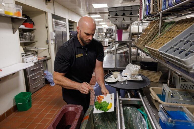 పోర్ట్‌ల్యాండ్‌లోని డిమిరో రెస్టారెంట్‌లో, సర్వర్లు ఆహార వ్యర్థాలను కంపోస్ట్ డబ్బాల్లోకి విసిరేస్తాయి. బ్రియానా సౌకప్/స్టాఫ్ ఫోటోగ్రాఫర్