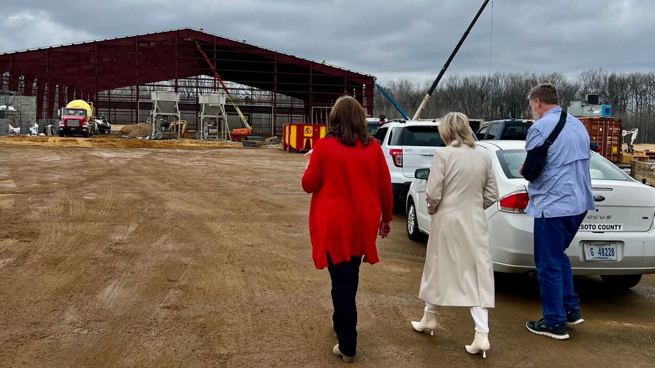 ఫోటో: ఎడమ నుండి, సూపరింటెండెంట్ లీ కాల్డ్వెల్ డెసోటో కౌంటీ అగ్రికల్చరల్ ఎడ్యుకేషన్ సెంటర్ మరియు అరేనా నిర్మాణ పురోగతిని U.S. సెనేటర్ సిండి హైడ్-స్మిత్ మరియు కౌంటీ రోడ్ సూపరింటెండెంట్ రాబర్ట్ జర్మన్లకు మార్చి 1, శుక్రవారం నాడు వివరించారు. (ఫోటో అందించబడింది)