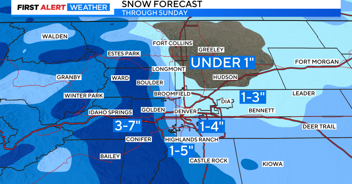 శనివారం రాత్రి మరియు ఆదివారం తెల్లవారుజామున ఫ్రంట్ రేంజ్లో కొలవదగిన మంచు కురిసే అవకాశం ఉంది. ఇది వెర్రి తుఫాను కాదు, కానీ డెన్వర్ ప్రాంతం అనేక అంగుళాల మంచు వరకు మేల్కొనే అవకాశం ఉంది. డెన్వర్ ప్రాంతం 1 నుండి 4 అంగుళాల మంచును చూడవచ్చు, ఉత్తరాన తక్కువ మంచు మరియు మీరు డగ్లస్ కౌంటీకి వెళ్లినప్పుడు ఎక్కువ మంచు ఉంటుంది.