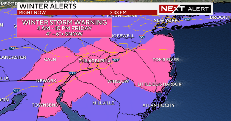శీతాకాలపు తుఫాను హెచ్చరిక శుక్రవారం ఉదయం 4 గంటల నుండి రాత్రి 10 గంటల వరకు అమలులో ఉంటుంది, ఫిలడెల్ఫియా మరియు I-95లో 4 నుండి 6 అంగుళాల మంచు కురిసే అవకాశం ఉంది మరియు దీని కారణంగా CBS ఫిలడెల్ఫియా తదుపరి వాతావరణ హెచ్చరిక: ఇది రోజంతా జారీ చేయబడుతుంది. మంచు.