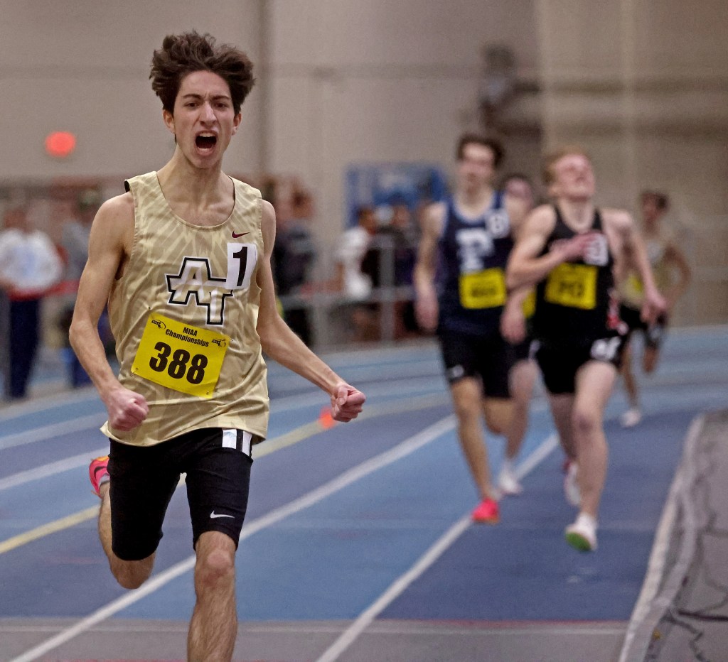 అల్గోన్క్విన్ యొక్క స్టీఫెన్ వైట్ తన విభాగంలో బాలుర మైలును గెలుపొందడంతో అతను ఘోషించాడు. రెండు-ట్రాక్ ఛాంపియన్షిప్ శనివారం రెగ్గీ లూయిస్ సెంటర్లో జరుగుతుంది. (సిబ్బంది ఫోటో/స్టువర్ట్ కాహిల్/బోస్టన్ హెరాల్డ్)