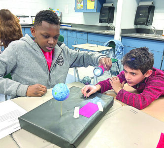అలెక్స్ ఇంపియన్, 12, మార్చి 14, 2024న క్లీవ్ల్యాండ్లోని రివర్సైడ్ ఎలిమెంటరీ స్కూల్లో నెక్మెడిన్ అల్జాబ్రి, 8, నిర్వహించిన మోడల్ శాటిలైట్పై ఫ్లాష్లైట్ని ప్రకాశిస్తుంది. వారు రాబోయే సంపూర్ణ సూర్యగ్రహణం గురించి నేర్చుకుంటున్నారు, ఈ అంశం ఉపాధ్యాయులను సవాలు చేసింది మరియు ప్రేరేపించింది. సూర్యగ్రహణం యొక్క మార్గంలో మరియు సమీపంలో. (AP ఫోటో/కరోలిన్ థాంప్సన్)