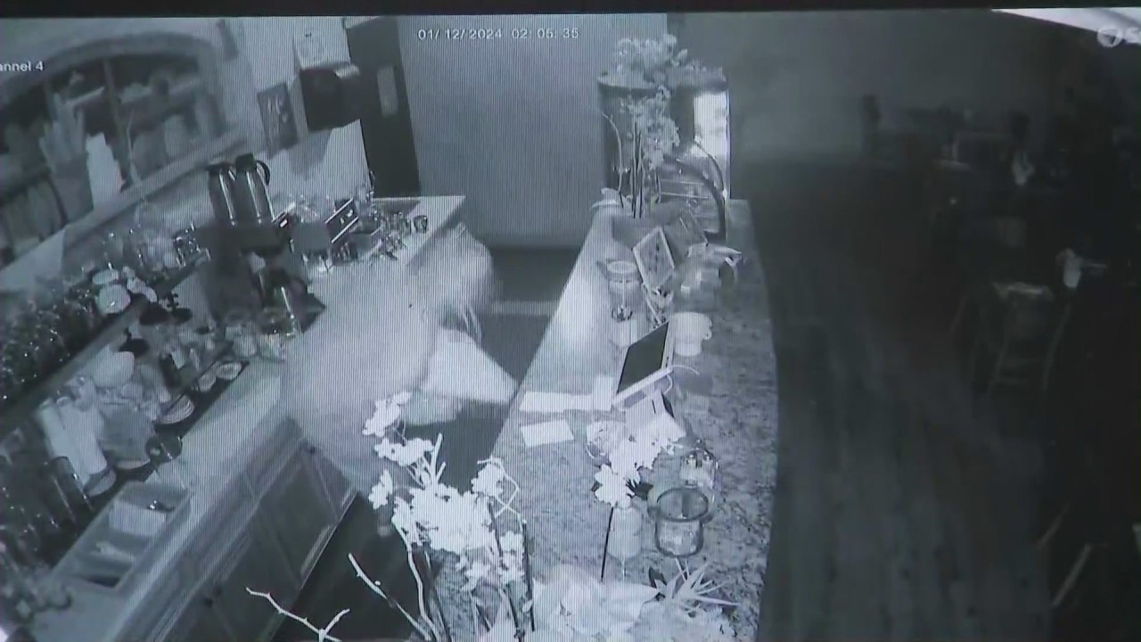 వుడ్ల్యాండ్ హిల్స్లోని దుకాణాల్లోకి ఒక వ్యక్తి విధ్వంసక దోపిడీల పరంపరలో చొరబడుతున్నట్లు నిఘా వీడియో చూపిస్తుంది.