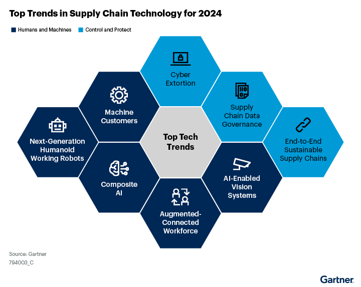ఈ సంవత్సరం సప్లై చైన్ టెక్నాలజీ ట్రెండ్‌లు రెండు ప్రధాన థీమ్‌ల ద్వారా నడపబడ్డాయి. ఒకటి, సప్లై చైన్ లీడర్‌లు తమ వ్యాపారాలను నిర్వహించడానికి మరియు రక్షించుకోవడానికి అభివృద్ధి చెందుతున్న సాంకేతిక పరిజ్ఞానాన్ని ఉపయోగించుకోవడం, మరియు మరొకటి మానవులు మరియు యంత్రాల పరిపూరకరమైన ఏకీకరణ ద్వారా పోటీ భేదం కోసం కొత్త అవకాశాలు. ప్రత్యేకంగా, గార్ట్‌నర్ 2024 కోసం ఎనిమిది వ్యూహాత్మక సరఫరా గొలుసు సాంకేతిక ధోరణులను గుర్తించింది, ఈ లక్ష్యాలను సాధించడంలో నాయకులకు సహాయపడుతుంది.