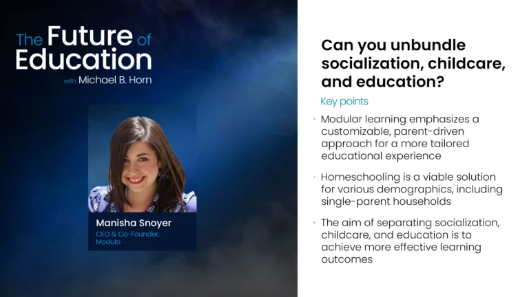 ఈ ప్రశ్న “ది ఫ్యూచర్ ఆఫ్ ఎడ్యుకేషన్”పై వినూత్నమైన చర్చకు ప్రధాన కారణం, ఇది అతిథి మనీషా స్నోయర్, మాడ్యులో CEO మరియు సహ వ్యవస్థాపకులతో కలిసి మైఖేల్ B. హార్న్ హోస్ట్ చేసిన పాడ్‌కాస్ట్. వారి సంభాషణ విద్య యొక్క అభివృద్ధి చెందుతున్న ప్రకృతి దృశ్యాన్ని పరిశోధిస్తుంది, అభ్యాస విధానాలను విప్లవాత్మకంగా మార్చడానికి హోమ్‌స్కూలింగ్ యొక్క సంభావ్యతపై ప్రత్యేక దృష్టి పెడుతుంది.