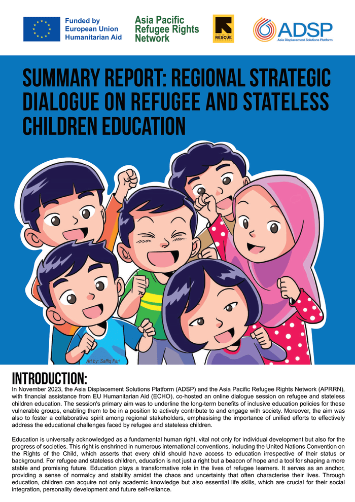 నవంబర్ 2023లో, ఆసియన్ డిస్ప్లేస్డ్ పర్సన్స్ సొల్యూషన్స్ ప్లాట్ఫారమ్ (ADSP) మరియు ఆసియా-పసిఫిక్ రెఫ్యూజీ రైట్స్ నెట్వర్క్ (APRRN), యూరోపియన్ యూనియన్ హ్యుమానిటేరియన్ అసిస్టెన్స్ (ECHO) నిధులతో శరణార్థులు మరియు స్థితిలేని పిల్లల విద్యపై ఆన్లైన్ డైలాగ్ను ప్రారంభించనుంది. . సెషన్కు సహ-హోస్ట్ చేసారు. ఈ సెషన్ యొక్క ప్రధాన లక్ష్యం ఈ బలహీన వర్గాలకు సమగ్ర విద్యా విధానాల యొక్క దీర్ఘకాలిక ప్రయోజనాలను హైలైట్ చేయడం, వారు సమాజానికి చురుగ్గా దోహదపడేలా మరియు నిమగ్నమయ్యేలా చేయడం. శరణార్థులు మరియు స్థితిలేని పిల్లలు ఎదుర్కొంటున్న విద్యాపరమైన సవాళ్లను సమర్థవంతంగా పరిష్కరించడానికి ఏకీకృత విధానం యొక్క ప్రాముఖ్యతను నొక్కిచెప్పడంతోపాటు, స్థానిక వాటాదారుల మధ్య సహకార స్ఫూర్తిని పెంపొందించడం కూడా దీని లక్ష్యం. విద్య అనేది ప్రాథమిక మానవ హక్కుగా విస్తృతంగా గుర్తించబడింది, ఇది వ్యక్తిగత అభివృద్ధికి మాత్రమే కాకుండా సామాజిక పురోగతికి కూడా అవసరం. బాలల హక్కులపై ఐక్యరాజ్యసమితి కన్వెన్షన్తో సహా అనేక అంతర్జాతీయ ఒప్పందాలలో ఈ హక్కు పొందుపరచబడింది, ఇది పిల్లలందరికీ వారి స్థితి లేదా నేపథ్యంతో సంబంధం లేకుండా విద్యా హక్కును కలిగి ఉండాలని పేర్కొంది. శరణార్థులు మరియు స్థితిలేని పిల్లలకు, విద్య అనేది కేవలం ఒక హక్కు మాత్రమే కాదు, అది మరింత స్థిరమైన మరియు ఆశాజనకమైన భవిష్యత్తును రూపొందించడానికి ఒక ఆశాకిరణం మరియు సాధనం. శరణార్థుల జీవితాల్లో విద్య పరివర్తనాత్మక పాత్ర పోషిస్తుంది. ఇది వారి జీవితాలను తరచుగా వర్ణించే గందరగోళం మరియు అనిశ్చితి మధ్య సాధారణ మరియు స్థిరత్వం యొక్క భావాన్ని అందించడం ద్వారా యాంకర్గా పనిచేస్తుంది. విద్య ద్వారా పిల్లలు అకడమిక్ జ్ఞానాన్ని మాత్రమే కాకుండా సామాజిక ఏకీకరణకు, వ్యక్తిత్వ వికాసానికి మరియు భవిష్యత్తు స్వాతంత్య్రానికి అవసరమైన జీవిత నైపుణ్యాలను కూడా పొందుతారు.