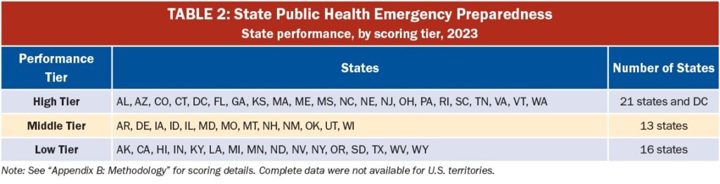 ఈ నివేదిక వివిధ రకాల ఆరోగ్య అత్యవసర పరిస్థితులకు ప్రతిస్పందించడానికి మరియు తొమ్మిది కీలక సూచికల ఆధారంగా నిరంతర ప్రజారోగ్య సేవలను అందించడానికి ప్రతి రాష్ట్రం యొక్క సంసిద్ధతను కొలుస్తుంది మరియు సమాఖ్య మరియు రాష్ట్ర విధాన రూపకర్తలకు మార్గనిర్దేశం చేస్తుంది. అత్యవసర సంసిద్ధతను మెరుగుపరచడానికి చర్య తీసుకోదగిన డేటాను అందించండి. నివేదిక రాష్ట్రాలు మరియు డిస్ట్రిక్ట్ ఆఫ్ కొలంబియాను తొమ్మిది సూచికల ఆధారంగా మూడు సంసిద్ధత స్థాయిలుగా (అధిక, మధ్యస్థ మరియు తక్కువ) వర్గీకరిస్తుంది.ఈ సంవత్సరం నివేదిక ప్రచురించబడింది హై పెర్ఫార్మెన్స్ టైర్‌లో 21 రాష్ట్రాలు మరియు డిసిలు, మీడియం పెర్ఫార్మెన్స్ టైర్‌లో 13 రాష్ట్రాలు మరియు తక్కువ పనితీరు టైర్‌లో 16 రాష్ట్రాలు ఉన్నాయి.