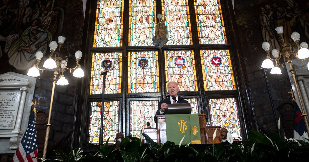 ప్రెసిడెంట్ బిడెన్ సోమవారం మాజీ అధ్యక్షుడు డొనాల్డ్ జె. ట్రంప్పై విరుచుకుపడ్డారు, అసంతృప్తి చెందిన నల్లజాతి ఓటర్లను కూడగట్టాలని కోరుతూ మరియు 2020 ఎన్నికలను “కొత్త బట్టలు ధరించి” తన పూర్వీకుల ప్రయత్నాలను “కొత్త బట్టలు” అని పిలిచారు. “పాత దయ్యాలు.” ”