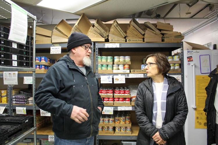 ఫిబ్రవరి 26న తక్కువ-ఆదాయ కుటుంబాల కోసం సంస్థ యొక్క ఫుడ్ ప్యాంట్రీని సందర్శించిన సందర్భంగా ఒరెగాన్ యొక్క 1వ జిల్లా కాంగ్రెస్ ఉమెన్ సుజానే బొనామిసి నైబర్హుడ్ హౌస్ యొక్క ఫుడ్ సెక్యూరిటీ ప్రోగ్రామ్ మేనేజర్ జిమ్ కూపర్తో మాట్లాడారు. (లారెన్ జిన్/బోనమిచి ఆఫీస్ సౌజన్యంతో)