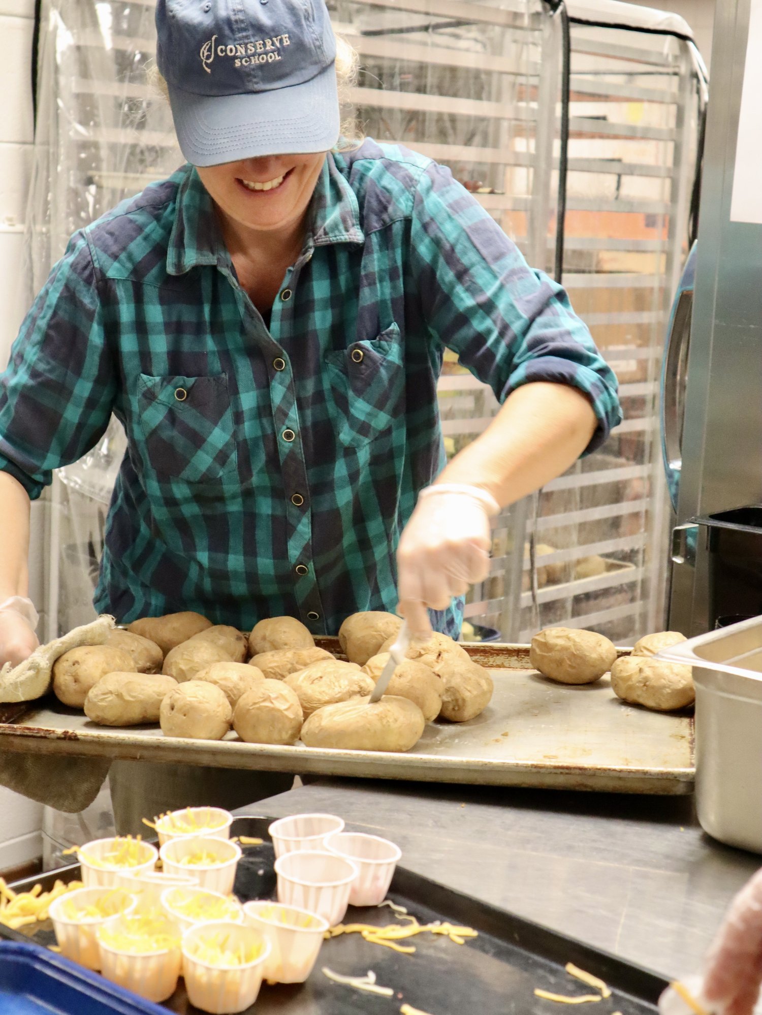 FIS ఫుడ్ సర్వీసెస్ డైరెక్టర్ అమీ వైట్ విద్యార్థులకు కొత్త ఆహారాలను పరిచయం చేయడానికి మరియు స్థానిక రైతులకు మద్దతు ఇవ్వడానికి ఉద్వేగభరితమైన న్యాయవాది. “మా వద్ద అదనపు స్థానిక ఆహార నిధులు ఉన్నాయి మరియు వాటిని ఉపయోగించాల్సిన అవసరం ఉంది, మరియు మేము మా విద్యార్థులకు ప్రత్యేక ట్రీట్ ఇవ్వాలనుకుంటున్నాము. మేము ఎల్లప్పుడూ రైతుల నుండి ఎక్కువ ఆహారాన్ని కొనుగోలు చేసే మార్గాలను కనుగొనాలనుకుంటున్నాము. నేను నా ఆలోచనను కొన్నీకి చెప్పాను మరియు మేము ప్రణాళికలు రూపొందించడం ప్రారంభించాము.”