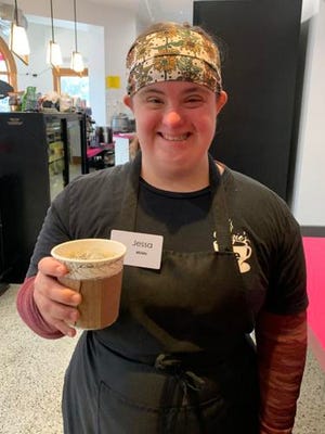 గ్రాండ్ హెవెన్‌లోని కెంజీస్ బీ కేఫ్‌లో జెస్సా లోరెన్‌హాగన్ చిరునవ్వుతో కాఫీ అందిస్తోంది.