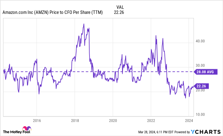 దాని ప్రస్తుత పరిమాణంలో కూడా, అమెజాన్ తన వ్యాపారాన్ని పెంచుకోవడంలో భారీగా పెట్టుబడి పెడుతోంది, కాబట్టి నేను ఆపరేటింగ్ క్యాష్ ఫ్లోపై స్టాక్లకు విలువ ఇవ్వాలనుకుంటున్నాను. స్టాక్ ధర మరియు ఒక్కో షేరు నిర్వహణ నగదు ప్రవాహాన్ని పోల్చి చూస్తే, స్టాక్ ధర దాని దీర్ఘకాలిక సగటుతో పోలిస్తే చౌకగా ఉంటుంది.