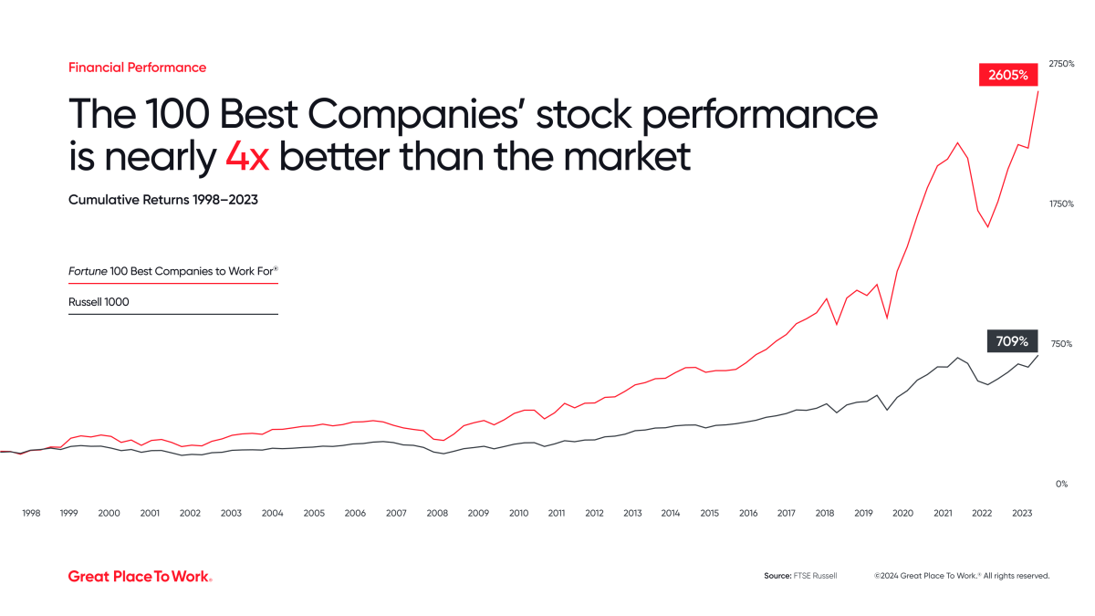 “ఉద్యోగి అనుభవం మరియు సంస్కృతి ఆధారంగా టాప్ 100 వంటి కంపెనీలను మూల్యాంకనం చేసేటప్పుడు వివిధ ప్రమాణాలను చూడటం స్టాక్ ధర పనితీరులో తేడాను కలిగిస్తుందని ఈ విశ్లేషణ చూపిస్తుంది. అంతే” అని లండన్ స్టాక్ ఎక్స్ఛేంజ్ గ్రూప్లోని స్టాక్ ఇండెక్స్ రీసెర్చ్ మేనేజర్ ర్యాన్ జీనోట్ అన్నారు. , ఇది యునైటెడ్ స్టేట్స్లో అతిపెద్ద స్టాక్ల సూచిక అయిన రస్సెల్ 1000ని సృష్టిస్తుంది.