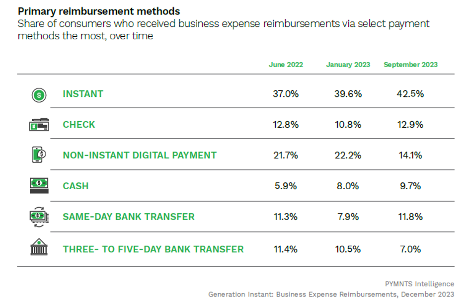 ఈ నేపథ్యంలో, తక్షణ చెల్లింపులు ఖర్చు రీయింబర్స్‌మెంట్ యొక్క ప్రాధాన్య పద్ధతిగా జనాదరణ పొందుతున్నాయి, దాదాపు సగం మంది వినియోగదారులు ఖర్చు రీయింబర్స్‌మెంట్‌ను స్వీకరించడానికి తక్షణ చెల్లింపులను ఇష్టపడతారు, సంవత్సరానికి 15% పెరుగుదల.