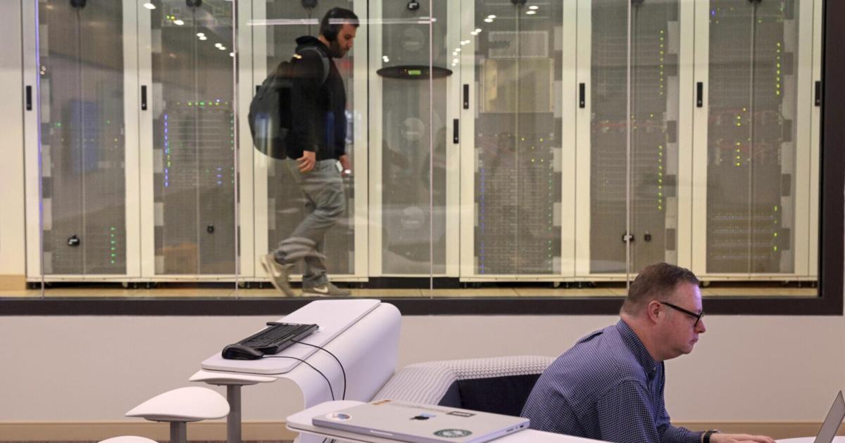 డిసెంబర్ 13, 2023, బుధవారం మేరీల్యాండ్ హైట్స్లోని వరల్డ్ వైడ్ టెక్నాలజీ అడ్వాన్స్డ్ టెక్నాలజీ సెంటర్ యొక్క AI డేటా సెంటర్లో ల్యాబ్ సర్వీసెస్ మేనేజర్ డెరిక్ హైడెమాన్ డిజిటల్ కార్డ్ని మారుస్తున్నట్లుగా NVIDIA DGX H100 సర్వర్ ఫోటో తీయబడింది. . వరల్డ్వైడ్ టెక్నాలజీ కస్టమర్ అవసరాలను తీర్చడానికి కృత్రిమ మేధస్సును అభివృద్ధి చేయడానికి $500 మిలియన్లను పెట్టుబడి పెట్టాలని యోచిస్తోంది. క్రిస్టియన్ గూడెన్ ద్వారా ఫోటో, cgooden@post-dispatch.com