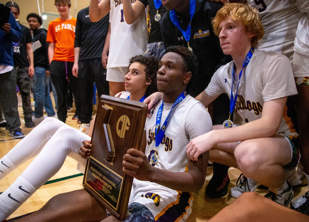 ఓక్లాండ్ — ఓక్లాండ్ టెక్ ఆటగాళ్ళు మరియు అర్’డారియస్ గ్రేసన్ (0) ట్రోఫీతో పోజులిచ్చారు. మార్చి 5, 2024న ఓక్లాండ్ టెక్నికల్ హై స్కూల్లో జరిగిన CIF డివిజన్ II నార్కల్ టైటిల్ గేమ్లో ఓక్లాండ్ టెక్ 73-66తో ఓక్లాండ్ను ఓడించింది (జోసెఫ్ డైకాస్/బే ఏరియా న్యూస్ గ్రూప్)