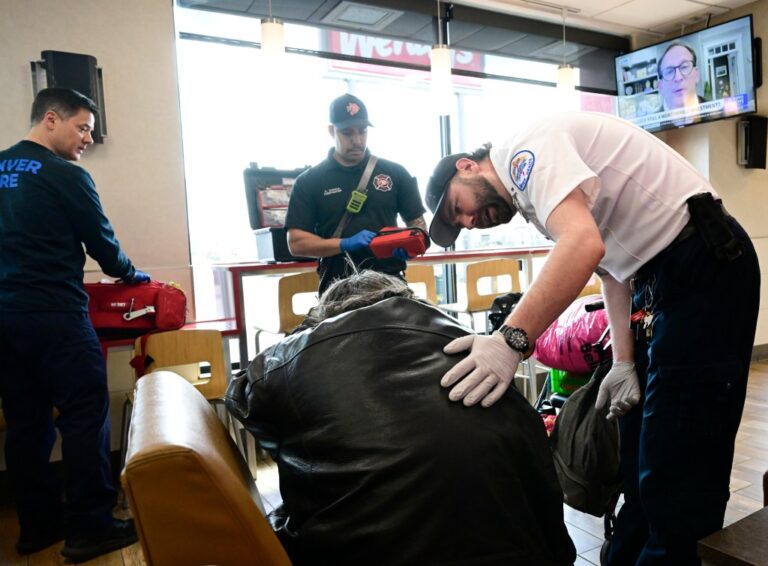 Denver Fire Department Capt. Eric Haag, left, firefighter Andres Garcia, center, and Denver Health Paramedics Lt. Alex Wilkinson, right, help a patient inside a fast food restaurant in north Denver on April 3, 2024. (Photo by Andy Cross/The Denver Post)