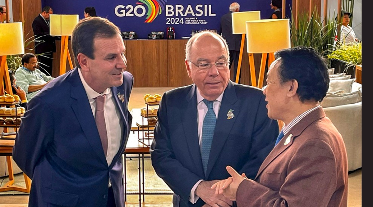 ఎడమ నుండి: ఎడ్వర్డో పేస్, రియో ​​డి జనీరో మేయర్. మౌరో వియెరా, బ్రెజిల్ విదేశాంగ మంత్రి. Mr. QU Dongyu, FAO డైరెక్టర్ జనరల్. (©FAO/Carolina Tendler)