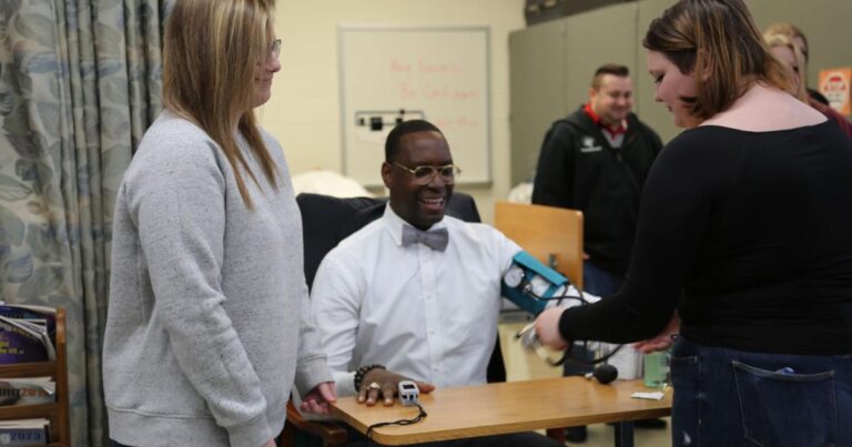 హెల్త్ సైన్సెస్ ప్రోగ్రామ్ నుండి మూమిన్ మరియు విద్యార్థుల మధ్య పరస్పర చర్య సందర్శన యొక్క ముఖ్యాంశం. బోధకుల మార్గదర్శకత్వంలో, విద్యార్థులు కీలకమైన సంకేతాలను కొలవడం ద్వారా వారి నైపుణ్యాలను ప్రదర్శించడానికి అవకాశం ఉంది.