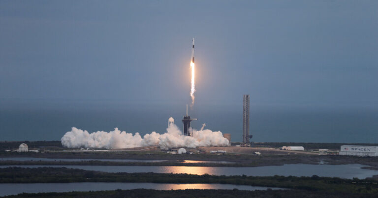 వ్యోమగాములు ఫ్లోరిడాలోని NASA యొక్క కెన్నెడీ స్పేస్ సెంటర్ నుండి ఫాల్కన్ 9 రాకెట్పై స్పేస్ఎక్స్ క్రూ డ్రాగన్ క్యాప్సూల్లో ప్రయోగించారు. అదనపు వాహన తనిఖీల కారణంగా ఒకరోజు ఆలస్యం తర్వాత, కౌంట్డౌన్ సజావుగా సాగింది మరియు సాయంత్రం 4:49 గంటలకు ETకి రాకెట్ ఇంజన్ వెలిగింది.