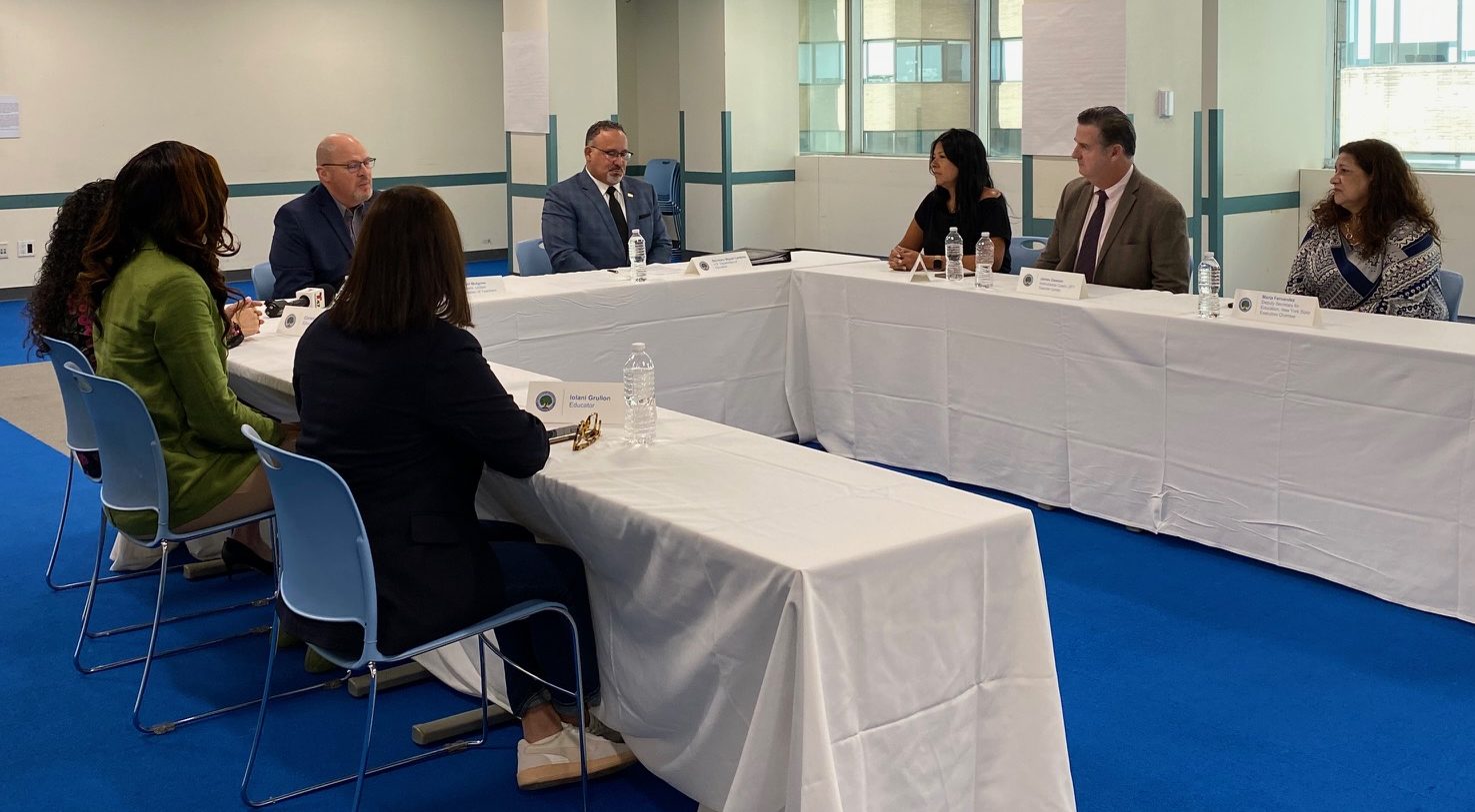 యునైటెడ్ స్టేట్స్ సెక్రటరీ ఆఫ్ ఎడ్యుకేషన్ మాన్హట్టన్ డౌన్టౌన్లోని యునైటెడ్ ఫెడరేషన్ ఆఫ్ టీచర్స్ (UFT) ప్రధాన కార్యాలయంలో మిగ్యుల్ కార్డోనా సోమవారం రౌండ్టేబుల్ చర్చను నిర్వహించారు. UFT అధ్యక్షుడు మైఖేల్ ముల్గ్రూ మరియు అనేకమంది న్యూయార్క్ నగర విద్యావేత్తలు మరియు ఉపాధ్యాయులు.