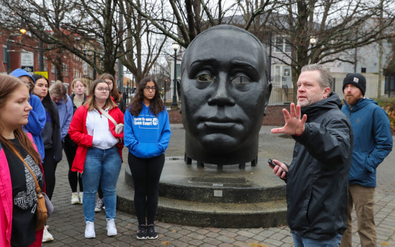 UNK political science professor Chuck Rowling, left, is seen teaching students about the history of Auburn Avenue in Atlanta, Georgia, from the perspective of “Through His Eyes,” a monument honoring civil rights leader John Wesley Dobbs.